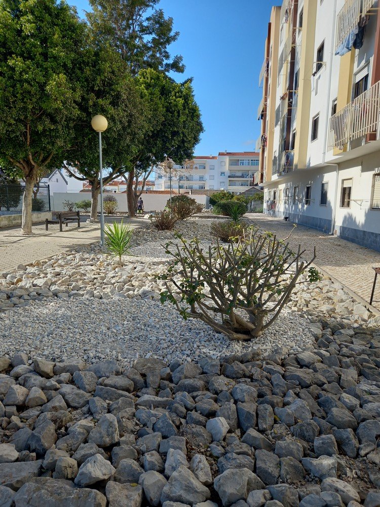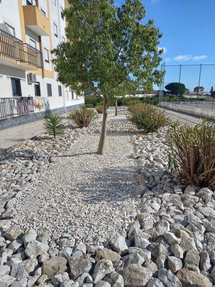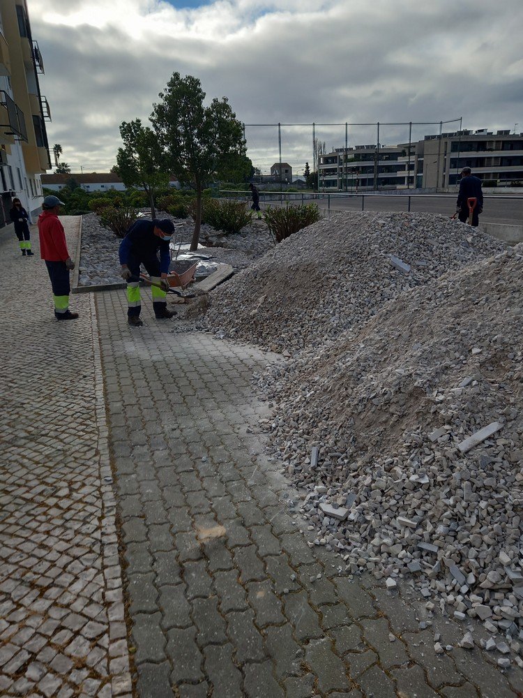 A equipa de espaços verdes e jardins e a equipa de obras procederam à remoção de raízes existentes, à colocação de tapete plástico para evitar o seu reaparecimento, finalizado com recurso a mármore triturado.